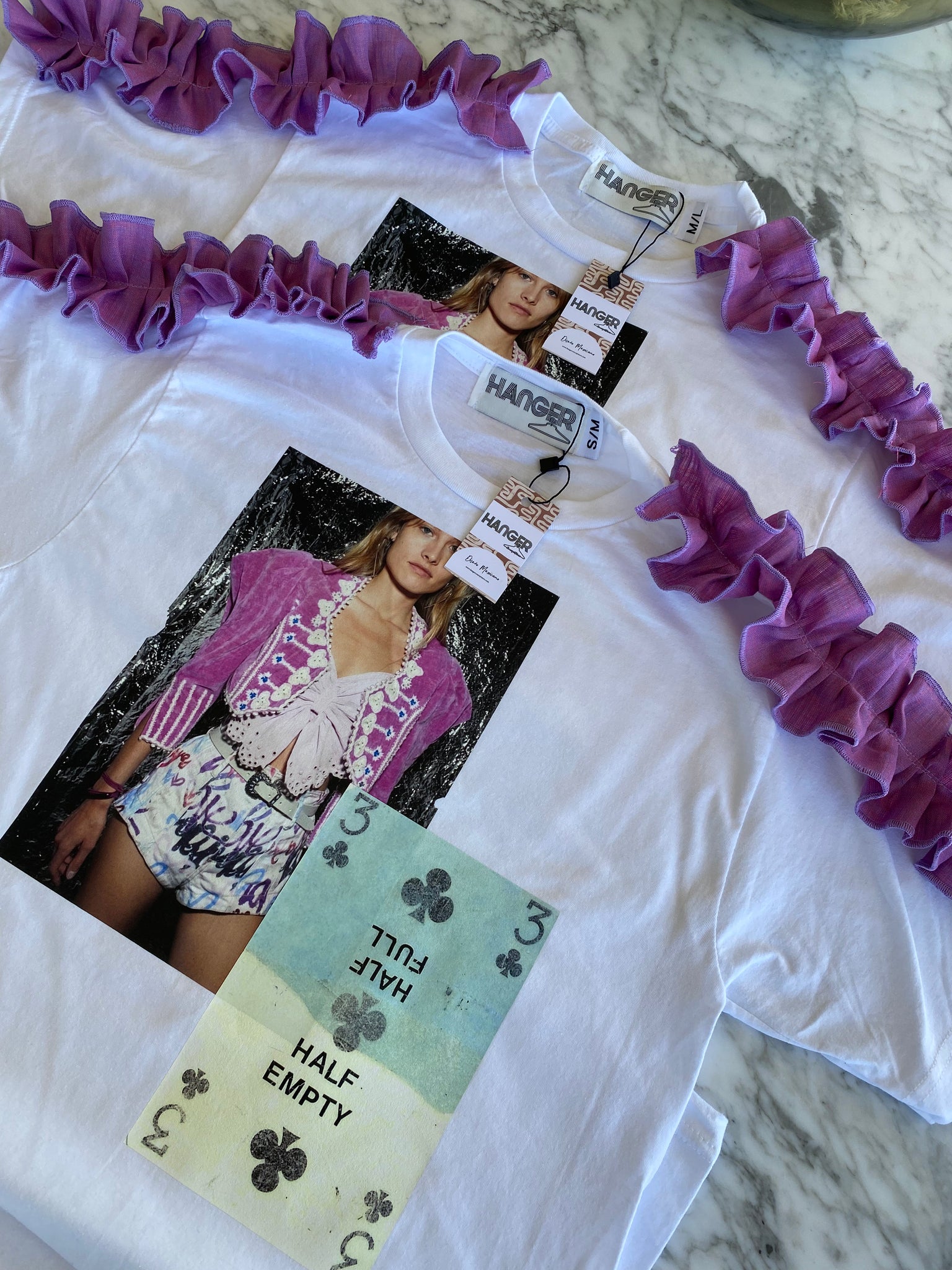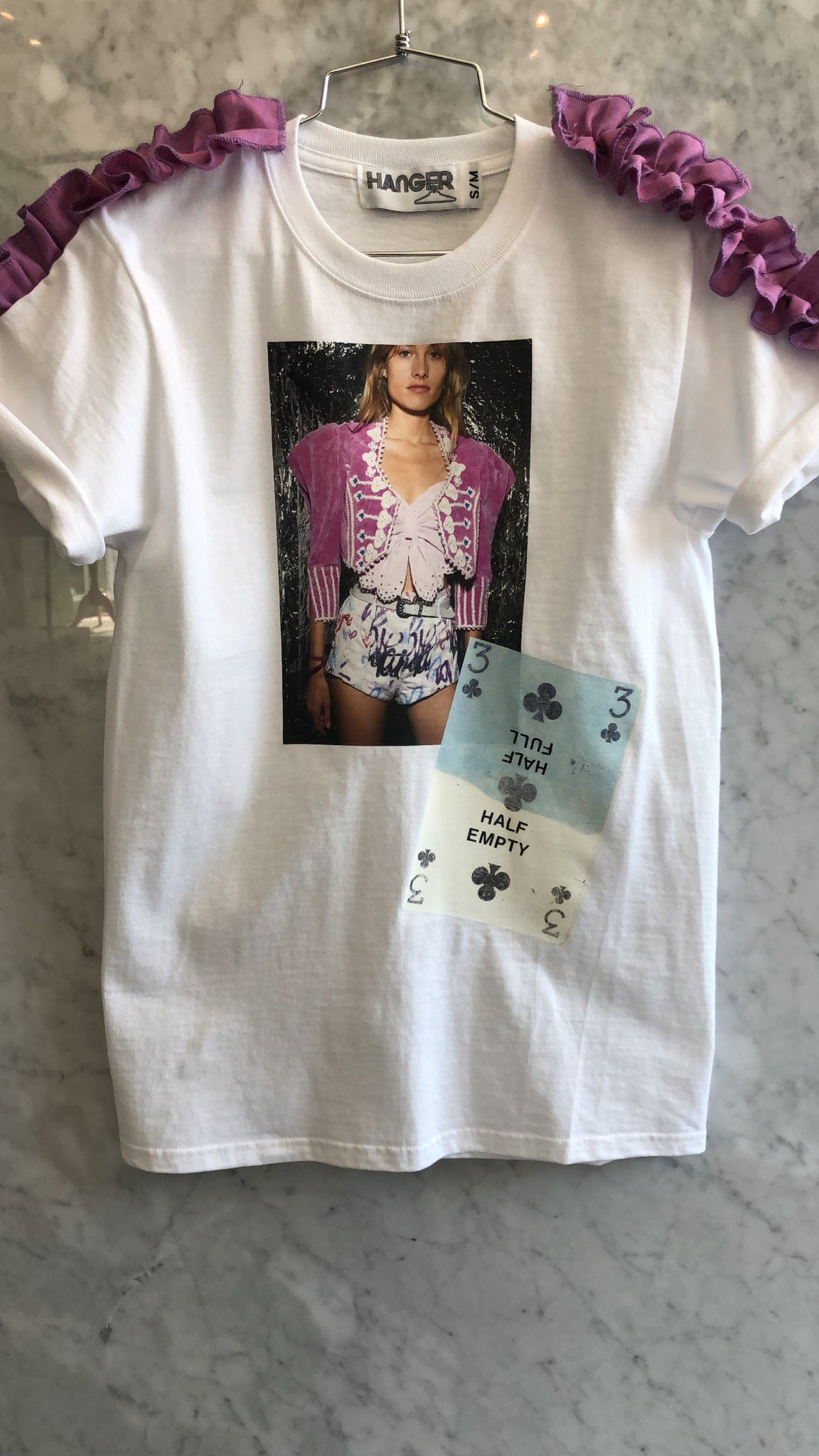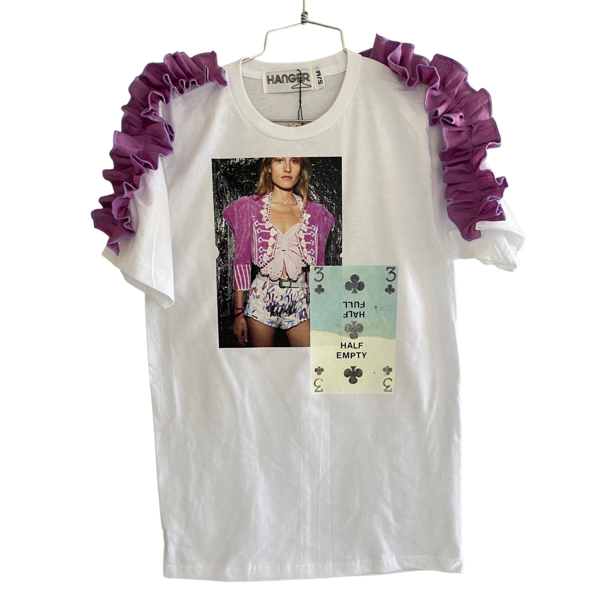 Playera de 100% algodón en color blanco con estampado doble transfer y mangas olan en hombro de tela de Lino 100% color violeta.