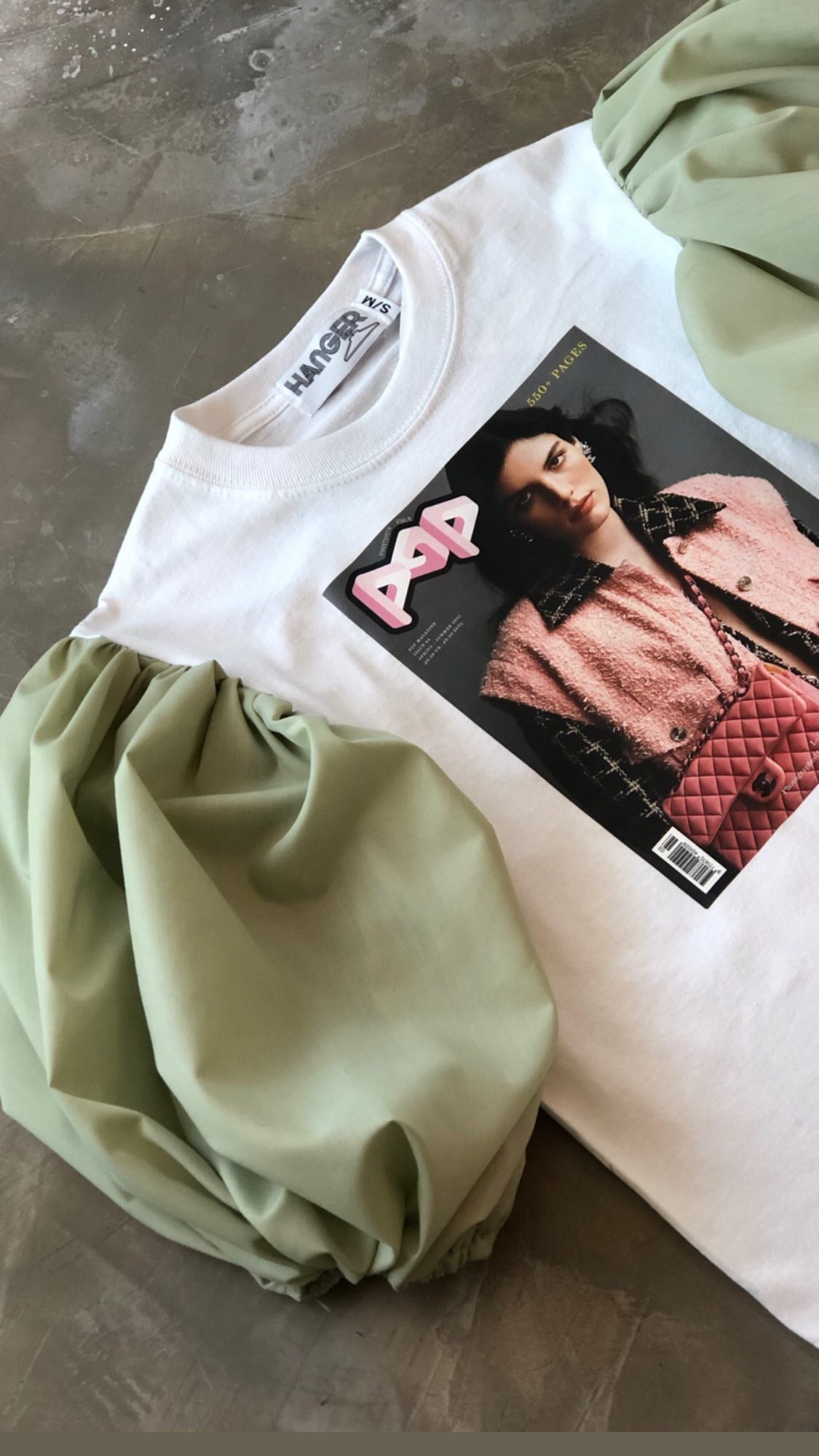 Playera de 100% algodón en color blanco con estampado transfer con magas bombachas de tela de algodón, color pistache.