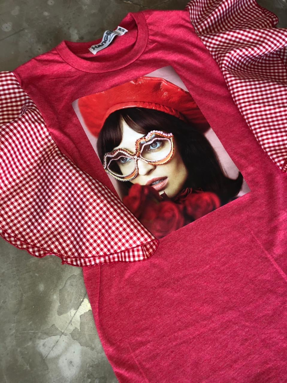 Playera de 100% algodón en color rojo, Estampado transfer y mangas de cuadros en tela de poliéster.