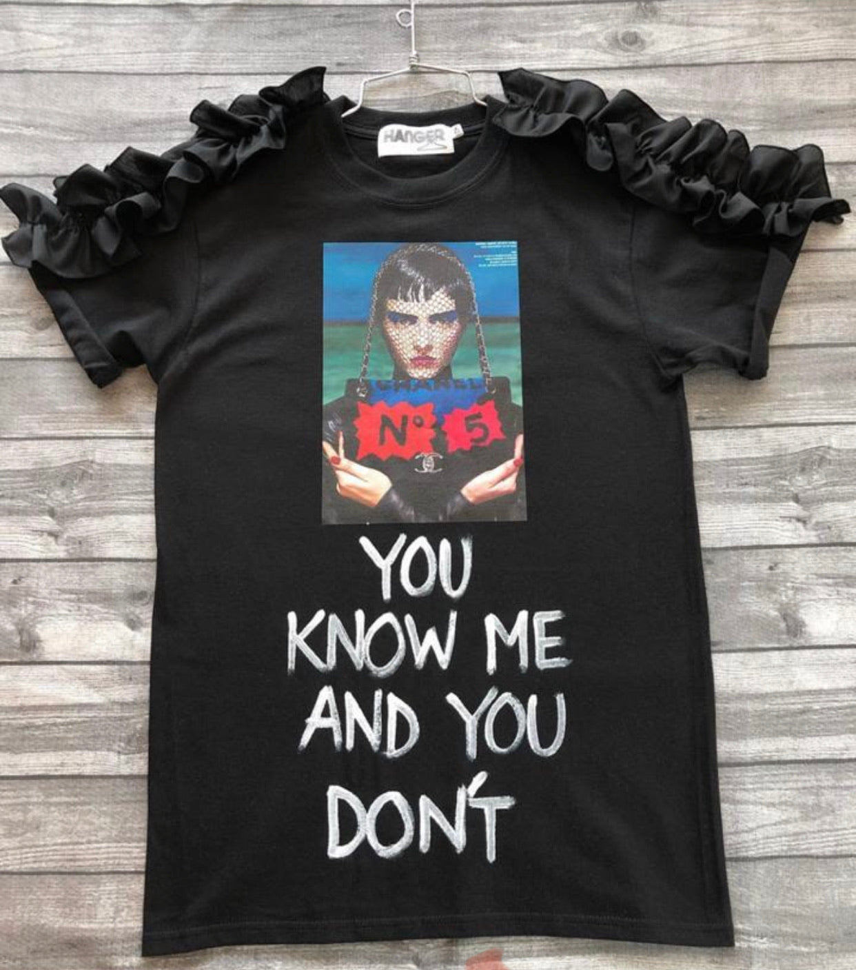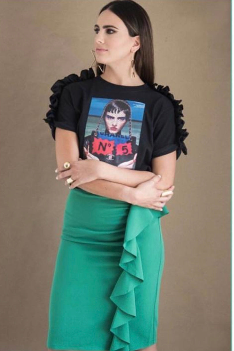 Playera de 100% algodón con estampado transfer, letras pintadas a mano y mangas ruffle en hombro.