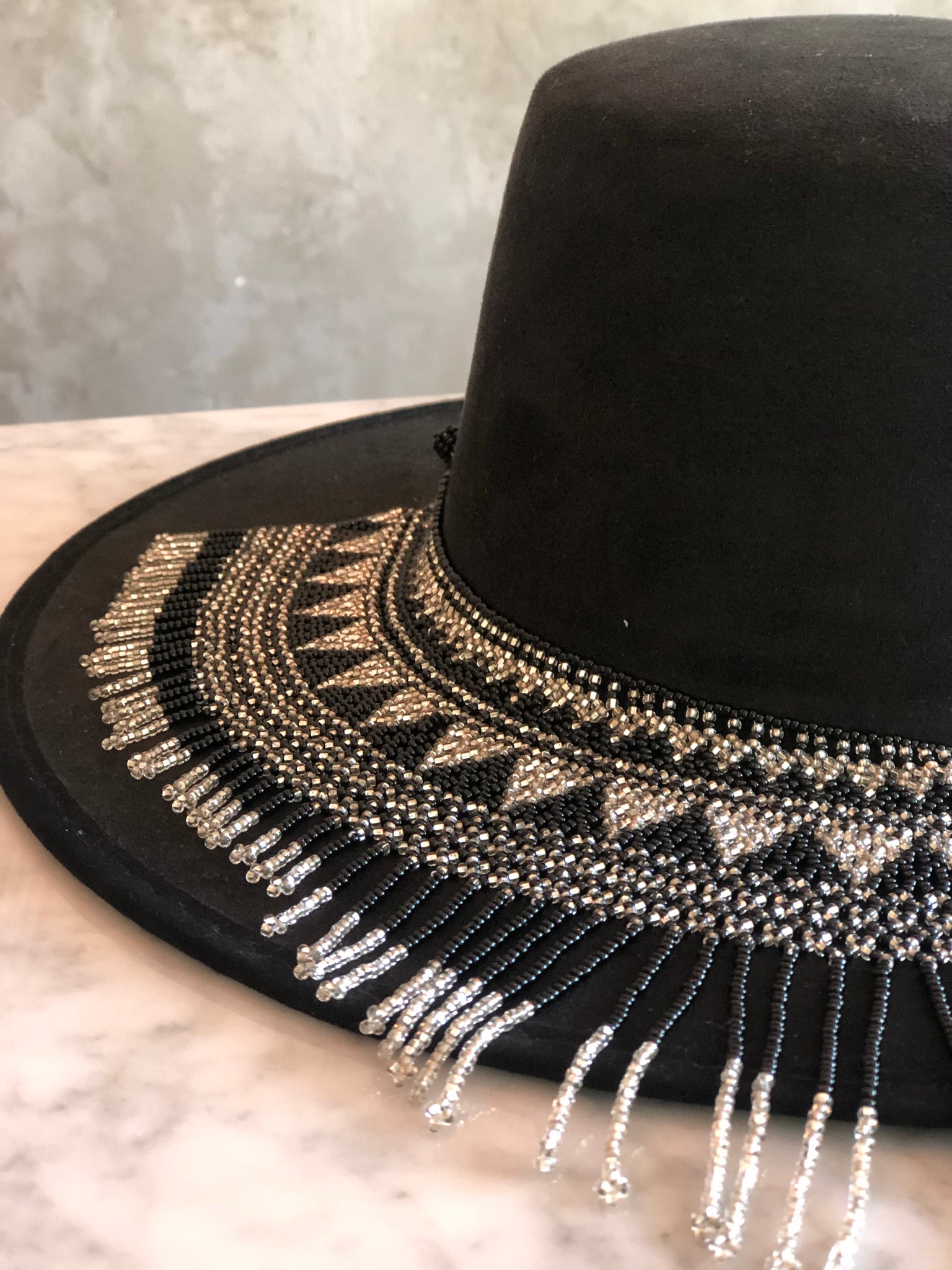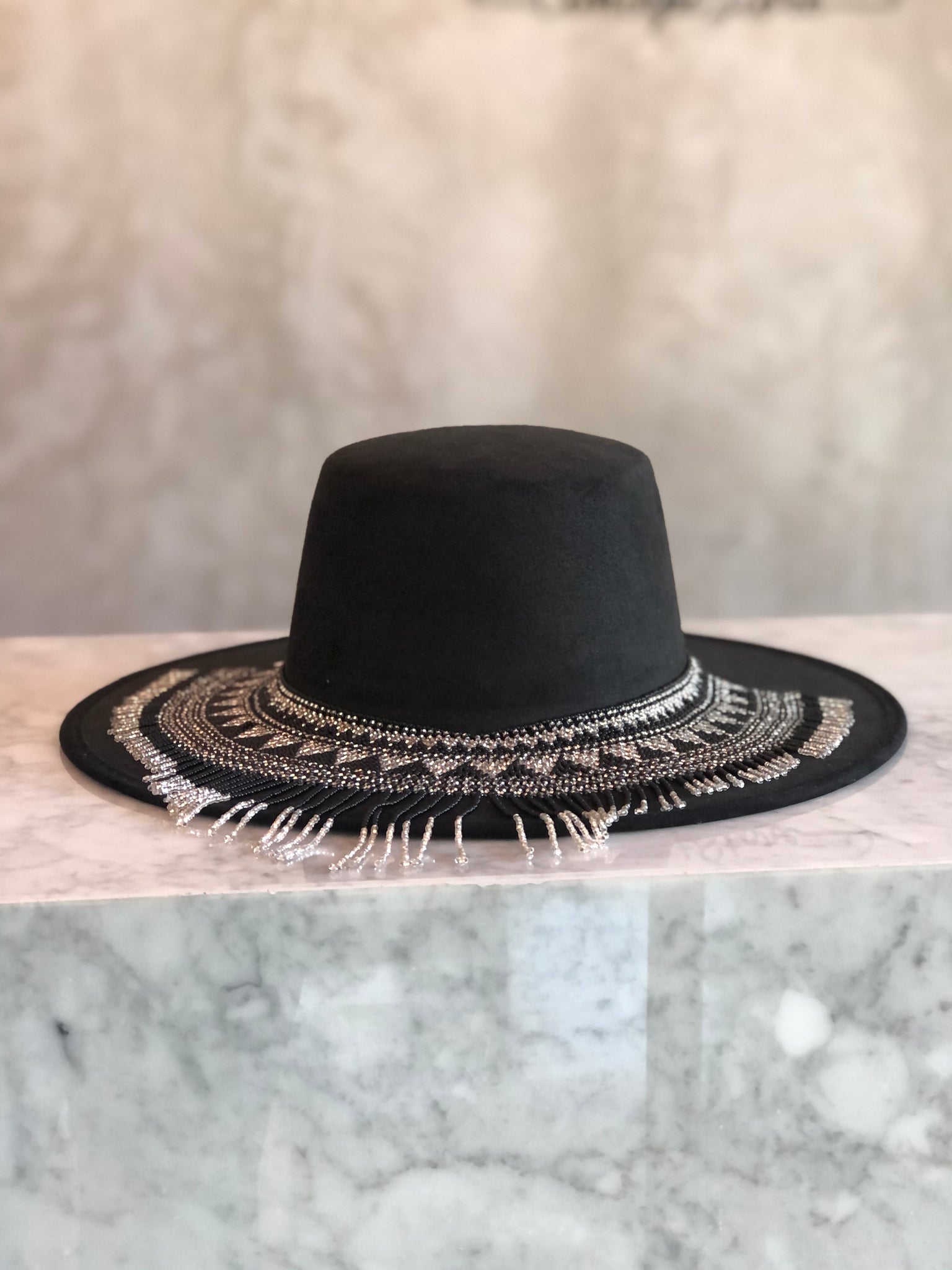 Sombrero de tela estilo gamuza color negro con accesorio de shakira en color negro con metálico hecho a mano por huicholes.