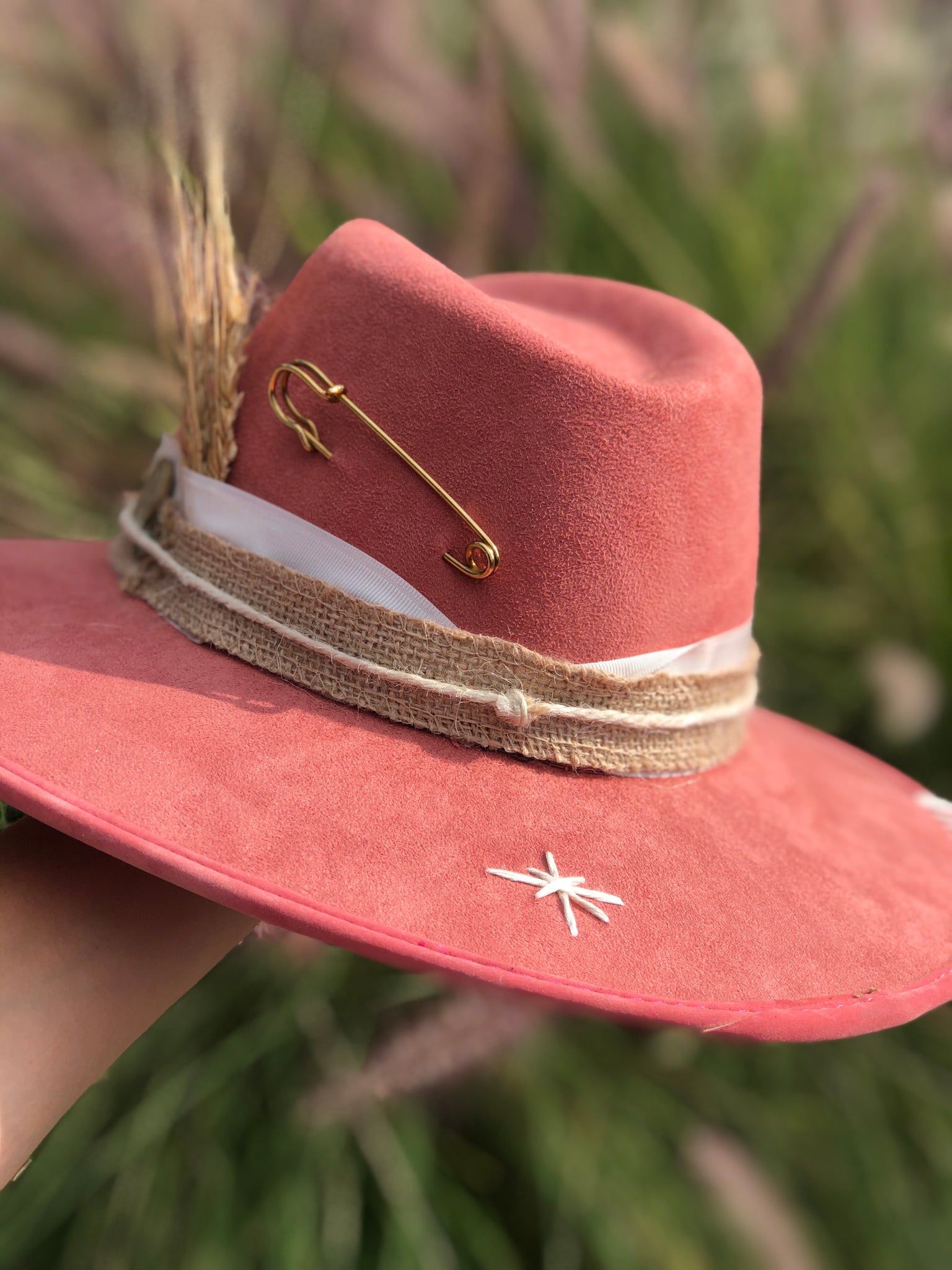 Sombrero de tela estilo gamuza color rosa con detalles hechos a mano