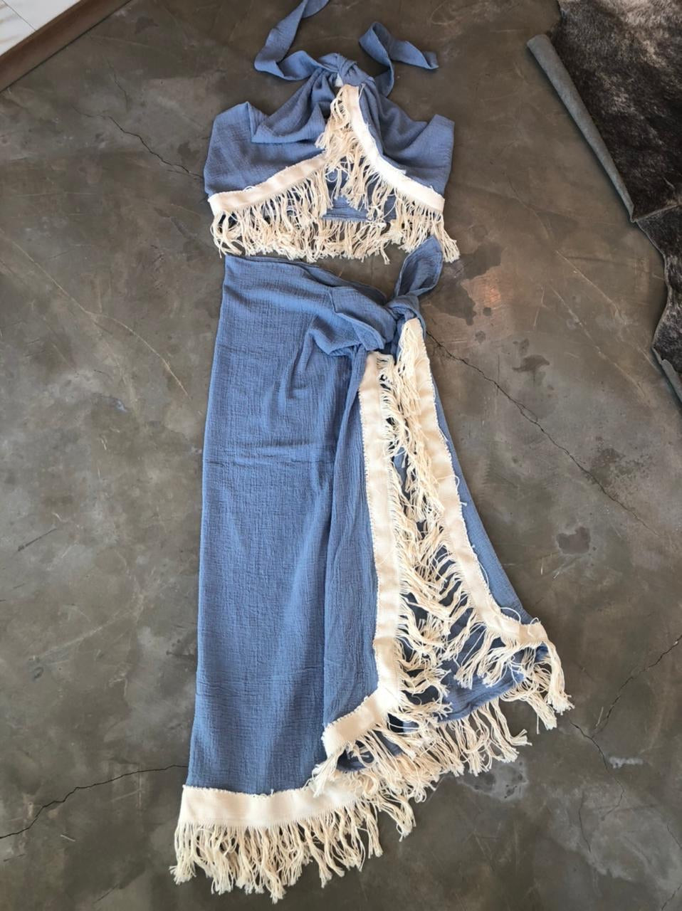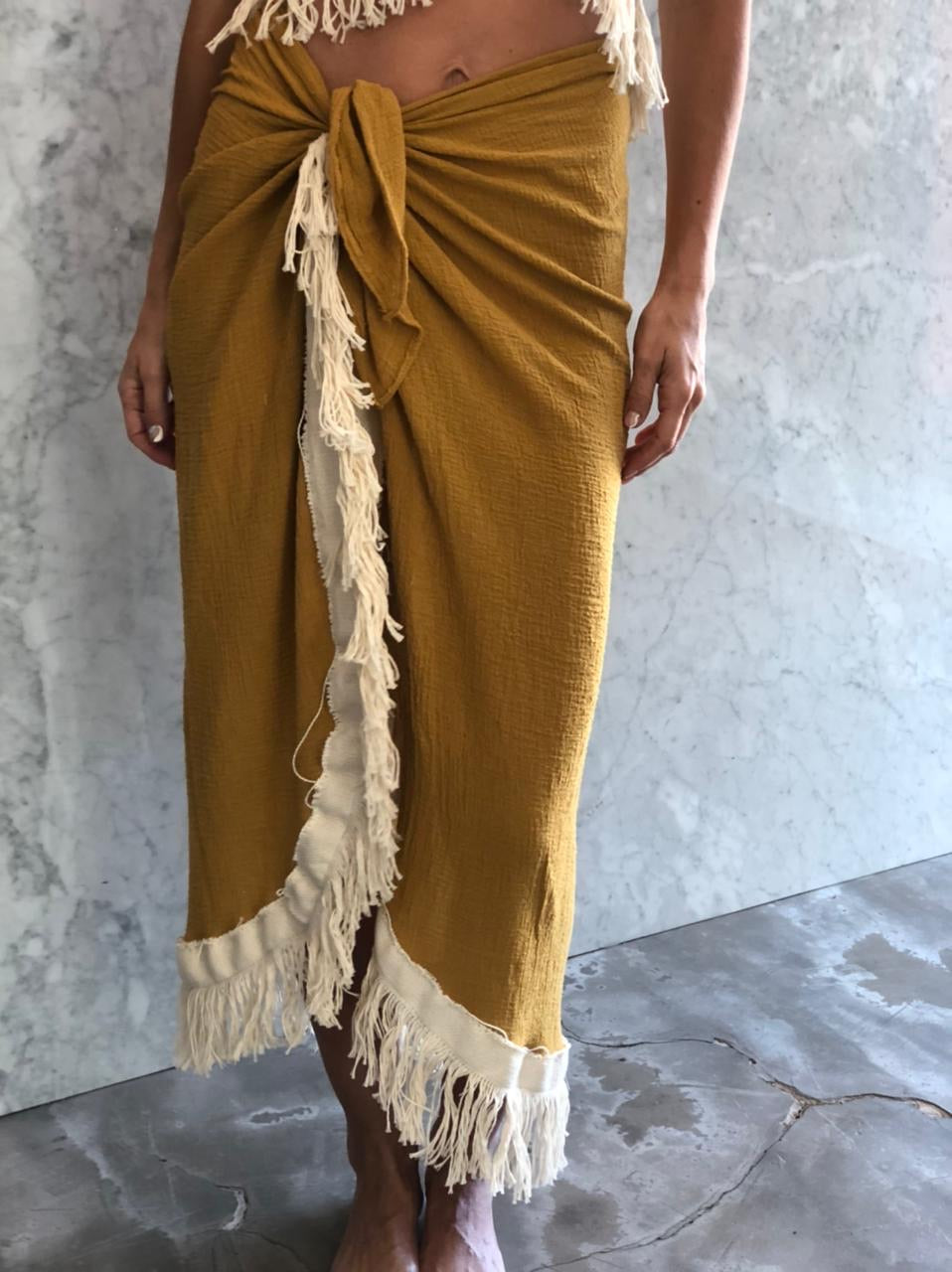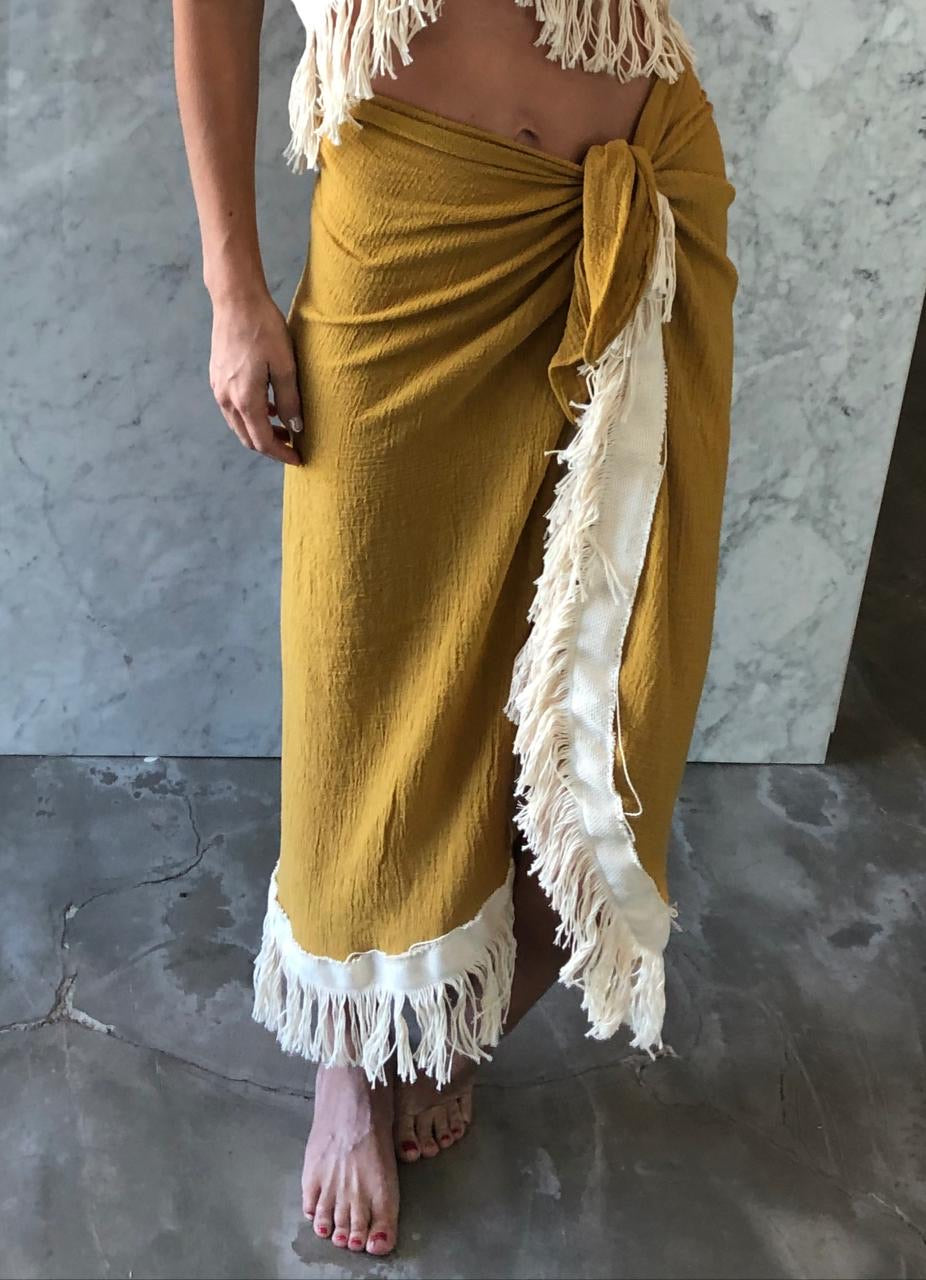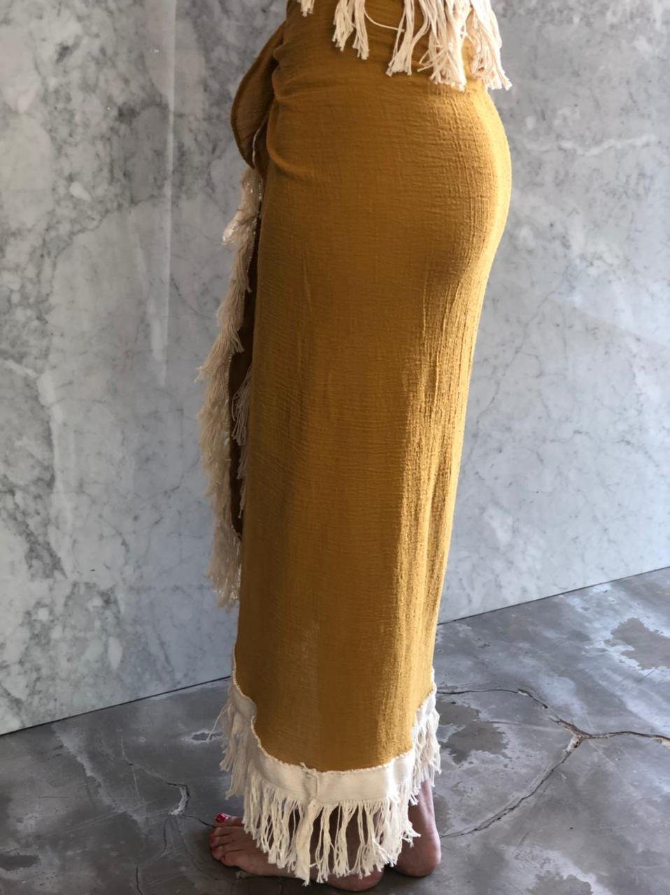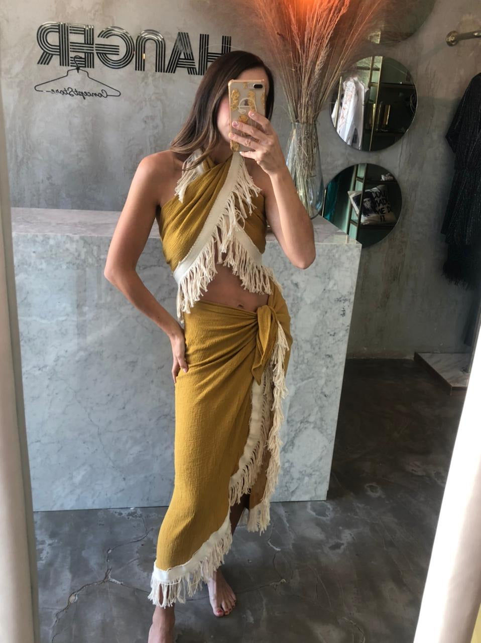 CONJUNTO DE TOP Y FALDA DE MANTA CORRUGADA DE 100% ALGODÓN EN COLOR MOSTAZA CON DETALLE DE MANTA DESILACHADA EN COLOR CRUDO.