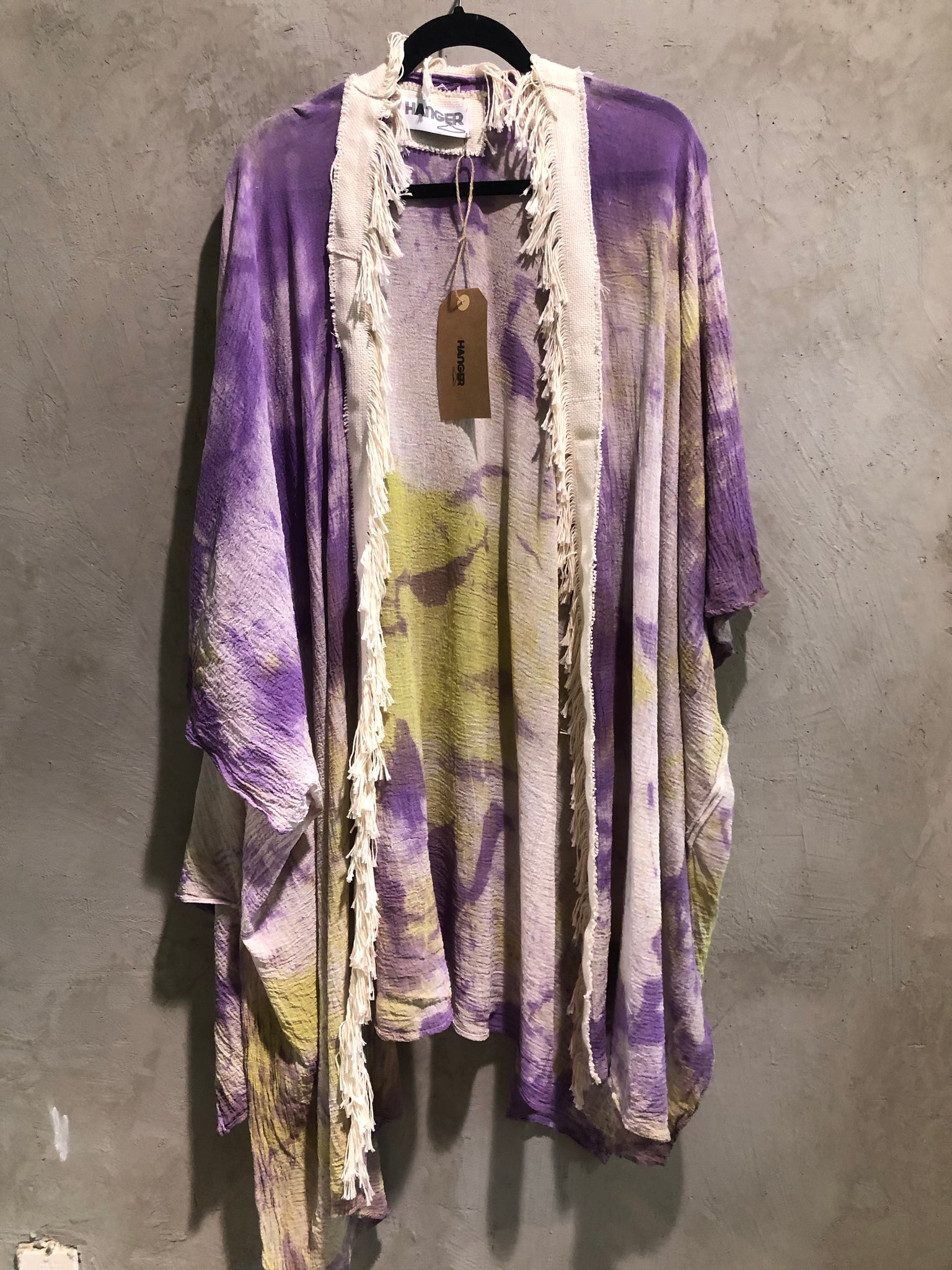 CAPA EN ACABADO TIE DYE COLOR LILA CON AMARILLO OPACO, TELA DE MANTA CORRUGADA CON DETALLE DE ACABO CON MANTA DECILACHADA EN COSTADOS.